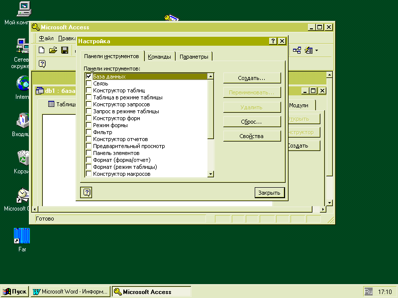 В данном разделе будут описаны практические приемы работы с интерфейсом MS Access. Это подразумевает указание названий (выделены жирным шрифтом) конкретных команд или кнопок, диалоговых окон, выбираемых для достижения стоящей перед пользователем цели. Различные версии пакета MS Access, очевидно, имеют некоторые отличия названий указанных объектов. Описываемые ниже «кнопочные» технологии непосредственно относятся к пакету MS Access 97; применение их к другим версиям возможно при условии нахождения команд, кнопок и диалоговых окон с аналогичными функциями. В приложениях 1 – 3 приведены названия и функции кнопок панелей инструментов MS Access 97.