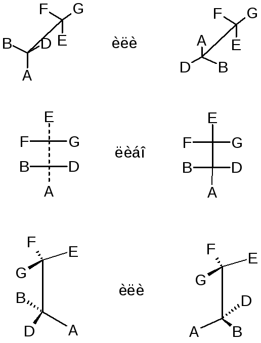 Способы изображения соединений с асимметрическим атомом углерода – энантиомеров (оптических изомеров) и соединений с несколькими асимметрическими атомами углерода – диастереомеров далеко не просты, также не просто и их восприятие. В принципе соединение с одним асимметрическим углеродом может быть изображено 12 внешне непохожими проекционными формулами. Поэтому введены определенные правила изображения (написания) проекционных формул, подробно изложенные в учебниках по стереохимии. Ниже приведены примеры стереоизображений энантиомеров (оптических антиподов) и диастереомера.