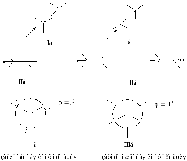 IIIа, IIIб – формулы Ньюмена. Молекулу рассматривают вдоль линии связи С–С в направлении, указанном стрелкой в верхней части чертежа. Три линии, расходящиеся из центра круга под углом 120оиз центра круга, обозначают связи ближайшего к наблюдателю углеродного атома. Линии, «высовывающиеся» из-за круга – связи удаленного углеродного атома.