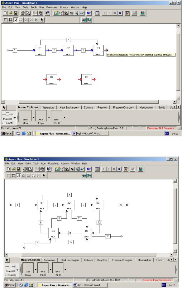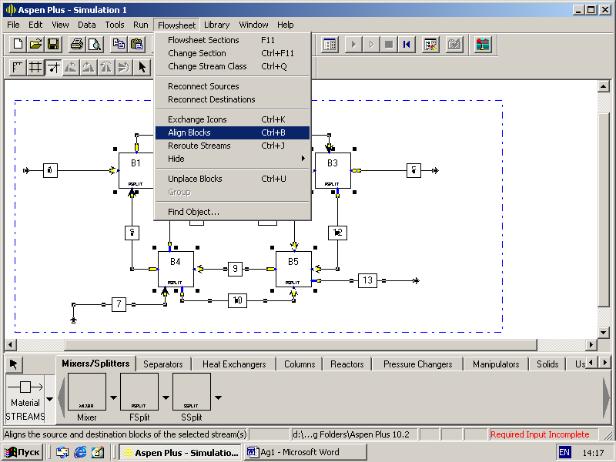 Нанесите на схему остальные аппараты, входные и выходные потоки. Соедините аппараты так, как показано на рис. 14. Если требуется выравнить потоки, то для этого необходимо выделить схему, выбрать пункт главного меню Flowsheet и щелкнуть на пункте Align Blocks (см. рис. 15).