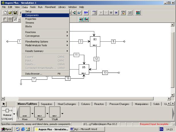 Для того чтобы ввести компоненты (химические вещества), необходимо в меню Data выбрать пункт Components (рис. 16).