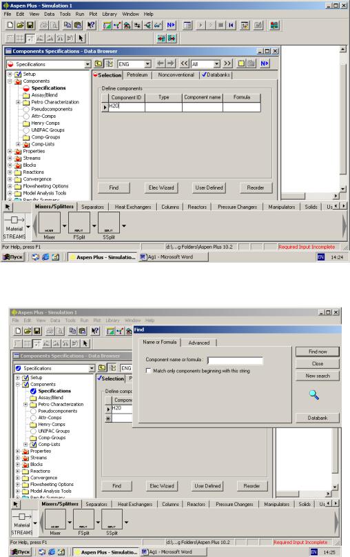 В результате, на экране появится окно поиска компонентов Find (рис. 18). В окне Find на закладке в поле Component name or formula вводится формула или имя компонента. Введите в данном поле формулу воды : H2O. Справа на этой же закладке расположены кнопки: Find now, Close, New search. Нажатие на кнопку Close закроет окно Find. Нажмите на кнопку Find now для того, чтобы найти нужный Вам компонент. После нажатия на данную кнопку окно Find увеличится в размерах и примет вид, показанный на рис. 19. В появившемся списке компонентов дважды щелкните левой кнопкой мышки на надписи WATER, либо пометив эту надпись, нажмите на кнопку Add, расположенную в нижней части окна Find. При нажатии на кнопку New Search можно найти следующий интересующий пользователя компонент. Нажмите на данную кнопку и добавьте в список компонентов этанол. Затем нажмите кнопку Close. Если Вы все сделали правильно, то на экране появится окно, практически совпадающее с изображенным на рис. 20.
