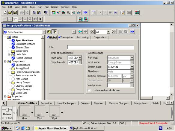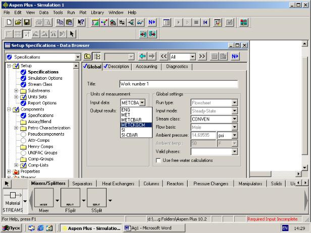 После того как химико-технологическая схема составлена, необходимо перейти к вводу параметров, исходных данных, специфицирующих расчет.