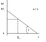 Пусть n = 1 или 2. Тангенс угла наклона (α) соответствующей прямой к оси Х (ось времени) равен константе скорости (рис 1.1, 1.2) - tgα = k. При n = 3 удвоенная константа скорости равна тангенсу угла (α) наклона прямой (рис. 1.3) - 2 tgα = k. Не представляет затруднений нахождение времени полупревращения из этих графиков.