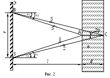 Интерференционная картина создаётся на экране, в плоскости которого находится точечный источник света S. Интерферируют лучи 1 и 2 от этого источника, отражающиеся от ближней и дальней поверхностей плоскопараллельной стеклянной пластины, и сходящиеся в точку В на экране, как показано на рис. 2.