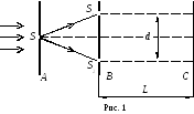 Свет, предварительно прошедший через светофильтр, проходя через отверстие S в экране A падал на экран В, в котором были проделаны две тонкие щели S1 и S2. Эти щели являлись когерентными источниками света и давали достаточно четкую картину интерференции на экране.
