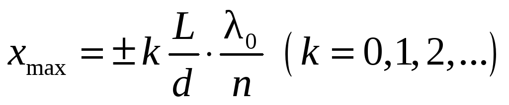 Для опыта Юнга (интерференция от двух щелей) указать положение первого максимума и записать условие следующего максимума через длину волны, расстояние от экрана до щели L и расстояние между щелями d (в опыте Юнга d<<L).