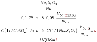 Полная динамическая обменная емкость катионита (ПДОЕ) вычисляется путем использования экспериментально найденных значений объема пропущенного через катионит раствора СuSO4 и объема пошедшего на титрование раствора Na2S2O3.