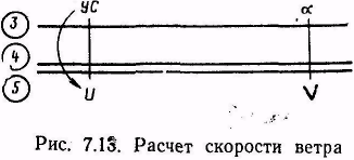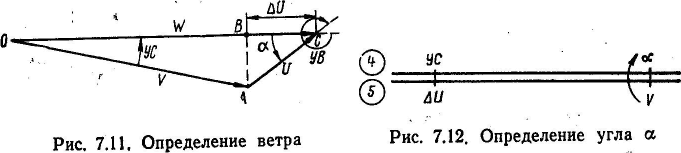 Решая эту пропорцию на НЛ-10М по шкалам 4 и 5, можно определить угол а (рис. 7.12), заключенный между линией фактического пути и метеорологическим направлением ветра. Измеряется этот угол от 0 до 90°. Зная величину угла а и используя шкалы 3 и 5 НЛ-10М, по теореме синусов определим скорость ветра (рис. 7.13).