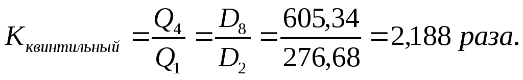 Следовательно, 20% самого бедного населения региона имели среднедушевой месячный доход менее 277 ден. ед., а остальные 80% населения – более 277 ден. ед. (экономическая интерпретация второго дециля). Одновременно 80% населения региона располагало среднедушевым месячным доходом до 605 ден. ед., а 20% самых богатых жителей – более чем 605 ден. ед. (экономическая интерпретация восьмого дециля).