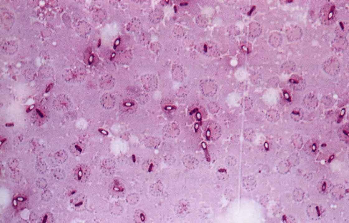 Б. Cl.chauvoei в патологическом материале, окраска по Романовскому-Гимза (споры не прокрашиваются);