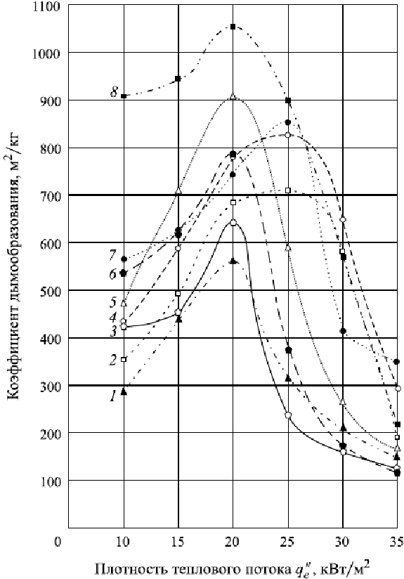 В дымовых газах, образующихся при сгорании древесины, обнаружено более 200 соединений – продуктов неполного сгорания. Максимальное значение оптической плотности при горении каждой из разновидностей древесины сложным образом зависит от плотности внешнего теплового потока. Коэффициент дымообразования при разложении и тлеющем горении древесины разных видов зависит от плотности внешнего теплового потока (рисунок 14).