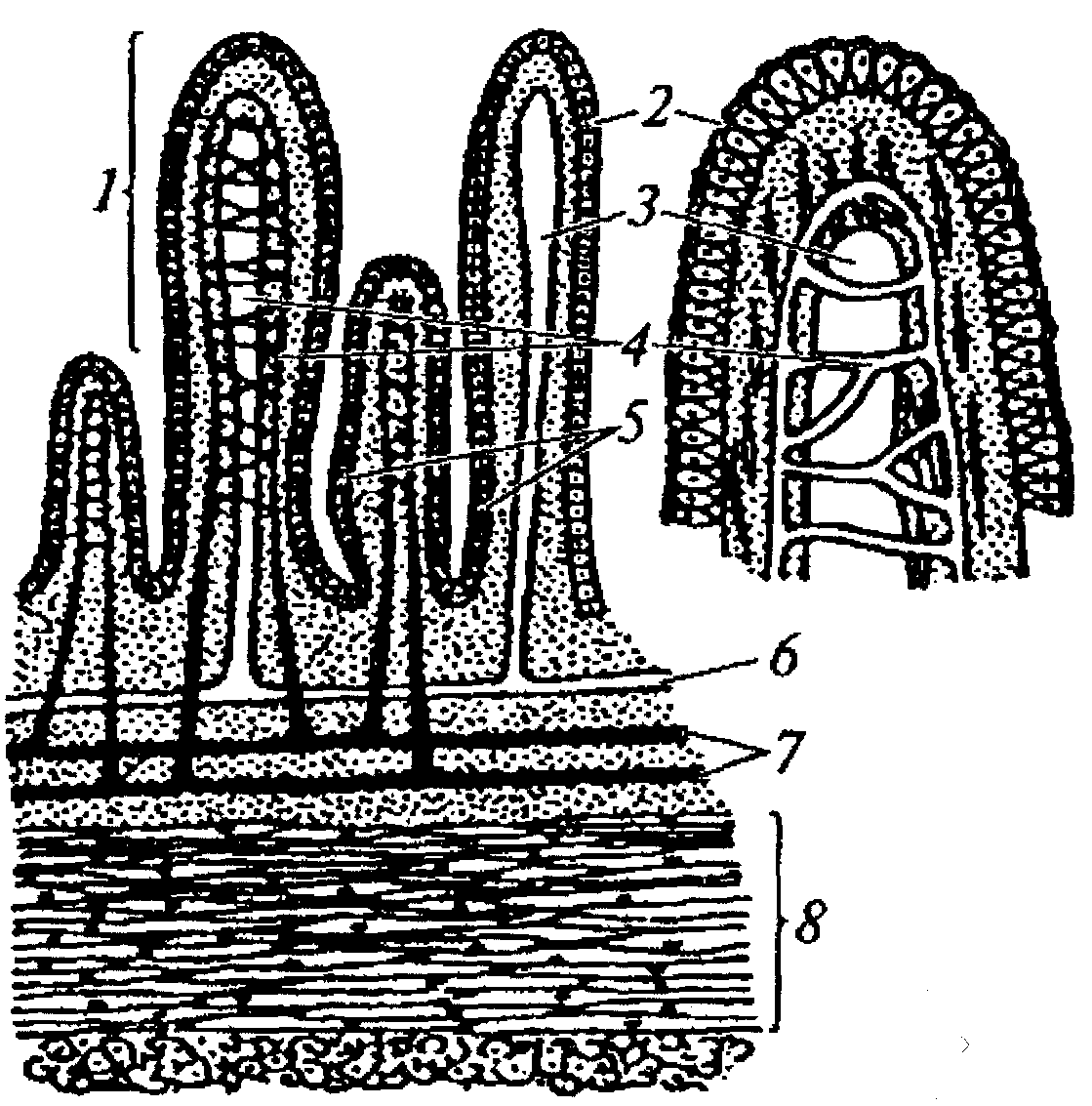 ворсинка, 2- слои клеток, через которые происходит всасывание, 3- начало лимфатического сосуда в ворсинке, 4- кровеносные сосуды в ворсинке, 5- кишечные железы, 6- лимфатический сосуд в стенке тонкой кишки, 7-кровеносные сосуды в стенке т онкой кишки, 8-часть мышечного слоя в кишечной стенке
