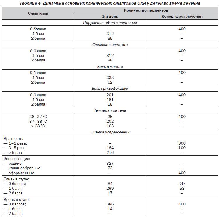 Кроме общих симптомов ОКИ была проанализирована динамика выраженности местных симптомов со стороны желудочнокишечного тракта. К 7му дню лечения частота дефекаций была в пределах физиологической нормы, из стула исчезли патологические примеси.