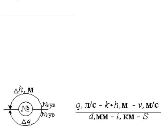 Принятый диаметр трубопровода проверяют на пропуск пожарного расхода этого участка, имея в виду, что скорости более 0,8–1,5 м/с нежелательны для диаметров менее 300 мм. Для больших диаметров скорости принимаются в пределах 1,5– 2,0 м/с. Значения принятых диаметров заносятся в табл. 16 и на расчётные схемы. Таким образом, на расчётных схемах сети по каждому режиму должны быть нанесены номера узловых точек, номера колец, башня и НС-II с водоводами, соединяющими их с сетью. Над каждым расчётным участком подписывается длина участка, расчётный расход, направление потока в виде стрелки и принятый диаметр трубопровода (l q d ), в узловых точках показывают отходящими стрелками расчётные узловые расходы. Оформление расчётной схемы сети для каждого расчётного случая выглядит следующим образом: схема а – для ручного расчёта по методу Лобачева–Кросса; схема б – для расчёта на ЭВМ.