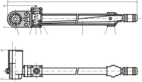 К л ю ч К Д М - 5 (рис. 5) состоит из корпуса 1, внутрь которого вмонтировано отсчетное устройство, состоящее из стакана 2, стержня-указателя 3, на котором нанесены деления тарировки пружины 4, храпового механизма 5, на наружную поверхность которого надеваются сменные насадки 6 под гайки Ml6, М20 и М24, фиксируемые с помощью установочного винта 7, рукоятки 8, соединенной шарнирно при помощи пальца 9 с корпусом ключа и резиновой втулки 10 для защиты корпуса от попадания в него угольной и породной пыли, грязи.