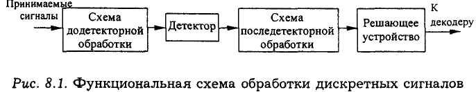 На рис. 8.1 приведена функциональная схема обработки дискретных сигналов. Принятый сигнал, искаженный помехой, в приемнике подвергается определенной обработке, детектируется и для опознавания поступает на решающее устройство. Очевидно, что вероятность правильного опознавания сигналов существенно зависит от отношения сигнала, к помехе на входе решающего устройства. В связи с этим основной задачей обработки сигналов в приемнике является увеличение отношения сигнал/шум. Обработка сигналов, как правило, сводится к тем или иным методам фильтрации.