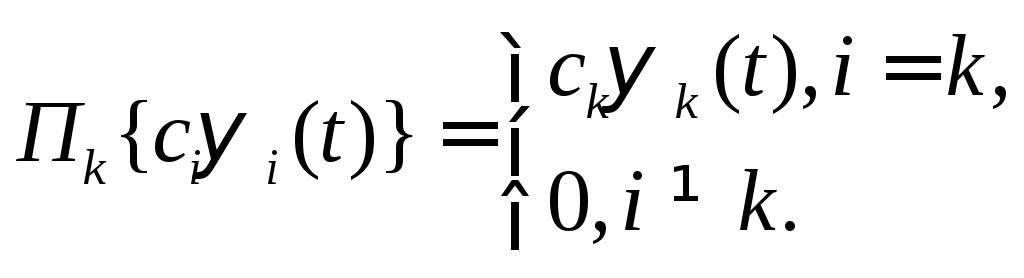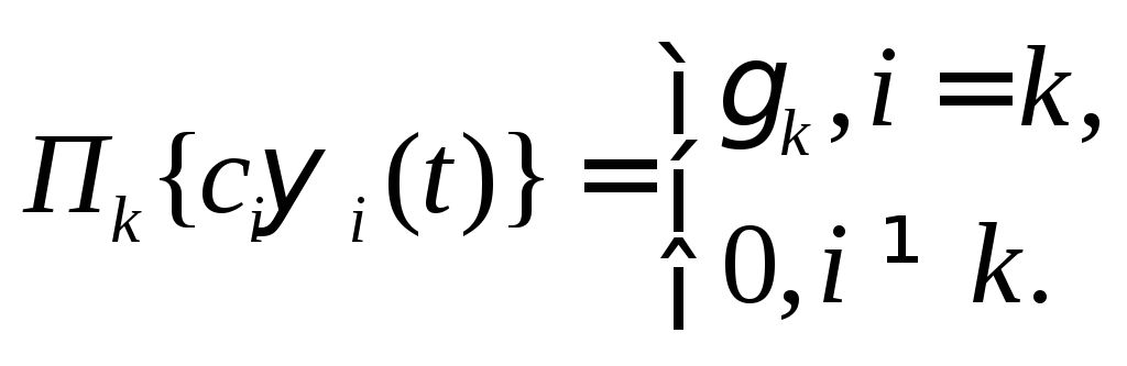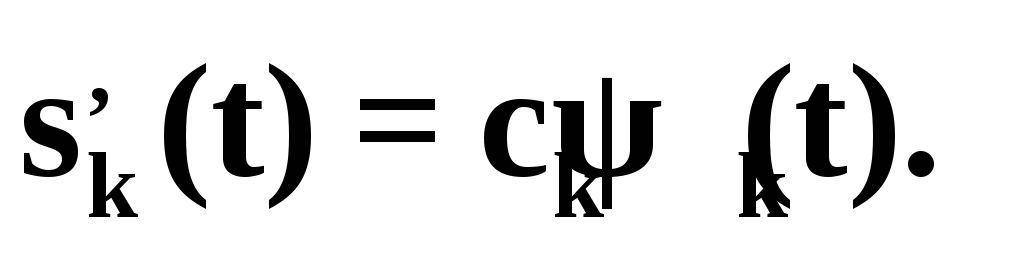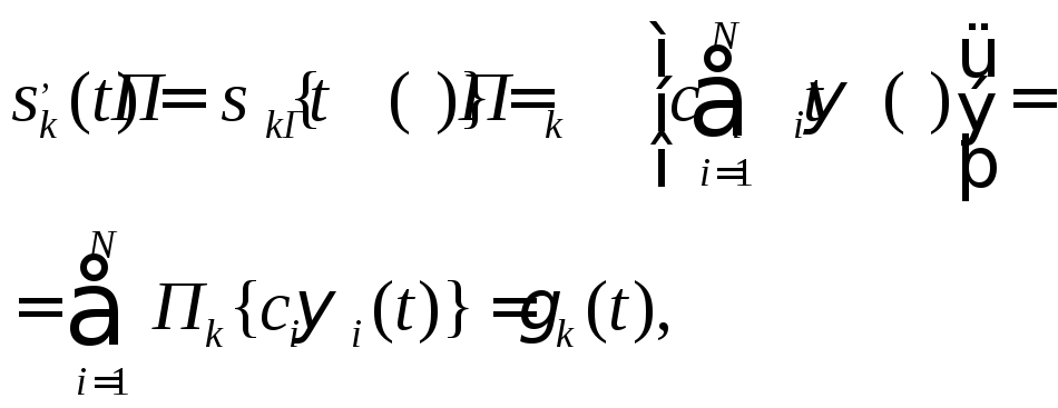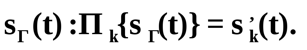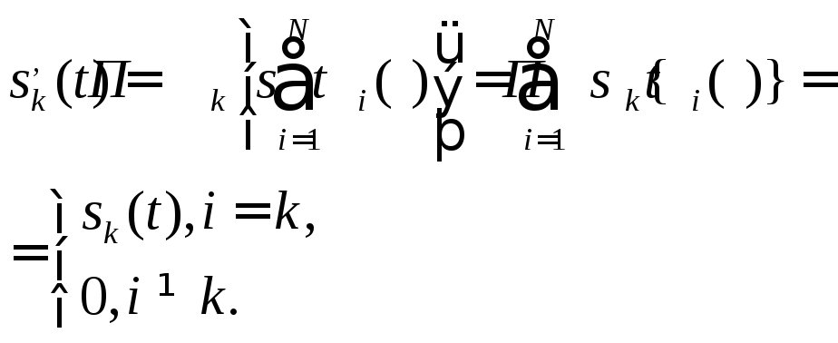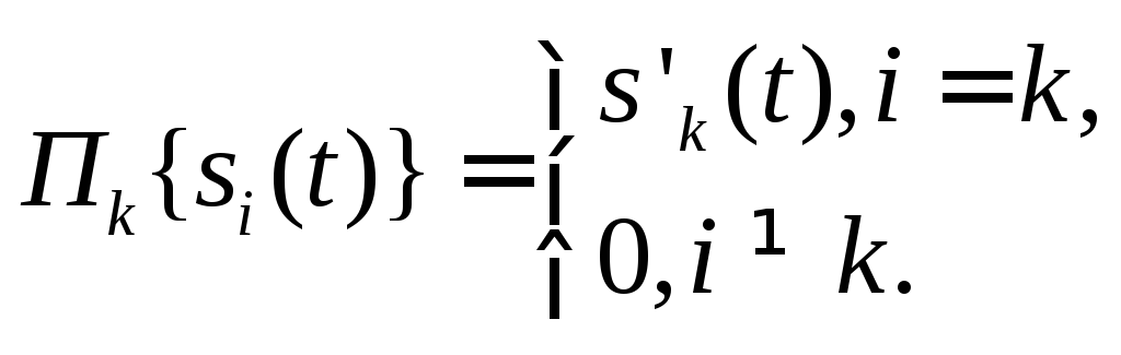 Для разделения N канальных сигналов на приемной стороне потребуется соответствующее число N разделяющих устройств, причем каждое k-e разделяющее устройство должно выполнять операцию выделения k-гo сигнала. Действие приемного устройства k-гo канала будем обозначать оператором разделения Пk. В идеальном случае k-e приемное устройство должно реагировать ("откликаться") только на сигнал sk(t) и давать нулевые отклики на сигналы всех других каналов. Дополнительным требованием к оператору будем считать его линейность, т. е. он должен удовлетворять принципу независимости действия (суперпозиция):