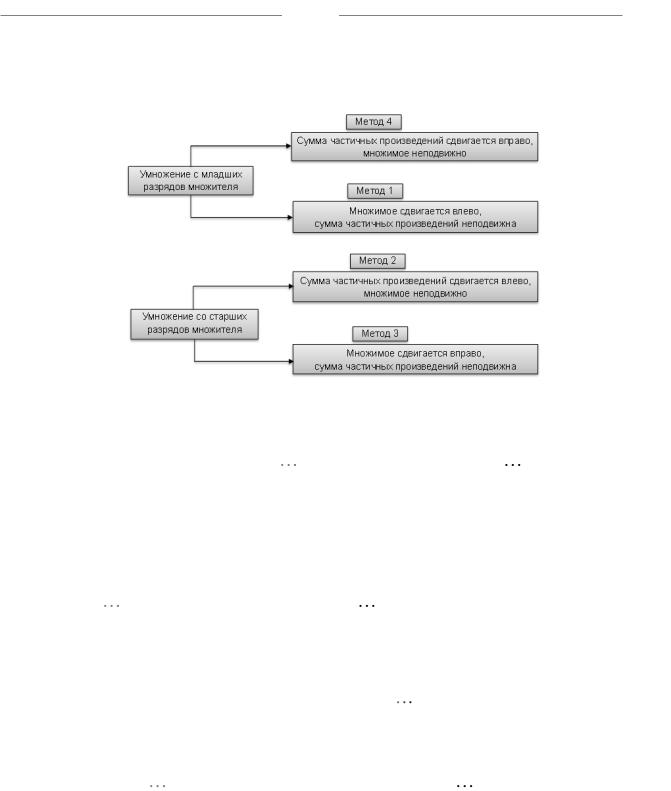 1.Умножение, начиная с младших разрядов множителя, при сдвиге множимого влево и неподвижной сумме частичных произведений.