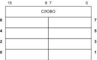 Оперативная память обычно имеет байтовую организацию, то есть адрес памяти является адресом ее соответствующего байта. Таким образом, информация в памяти (данные и команды) отыскиваются по адресу – номеру байта, начиная с которого располагается соответствующее хранилище (байт, слово, двойное слово). Адресом слов и двойных слов является адрес байта, с которого он располагается в памяти. В дальнейшем будем называть хранилище информации объемом 1 байт или несколько байтов – ячейкой памяти.