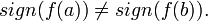 (Теорема о нуле непрерывной функции.) Если функция непрерывна на некотором отрезке и на концах этого отрезка принимает значения противоположных знаков, то существует точка, в которой она равна нулю. Формально: пусть