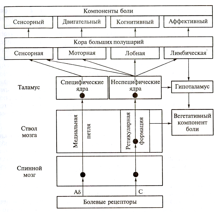 Блок-схема 1 компонентов боли и проводящих путей болевой чувствительности
