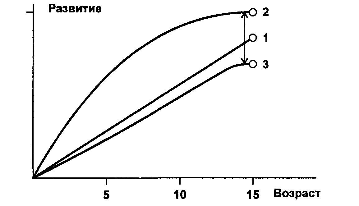 До появления акселерации в 50-60-е гг. физическое и духовное развитие детей и подростков было сбалансированным. На рисунке это показывает кривая 1, выражающая общую тенденцию нормального физиологического и социального созревания. В результате акселерации, наступившей в середине 70-х гг., физиологическое созревание организма (кривая 2) начинает опережать темпы умственного, психического, социального развития (кривая 3). Образуется несоответствие, которое можно выразить так: тело растет быстрее, чем созревают психические функции, являющиеся основой интеллектуальных, социальных, нравственных качеств. К тринадцати-пятнадцати годам у девочек, а к четырнадцати-шестнадцати годам у мальчиков, живущих в средних регионах нашей страны, физиологическое развитие организма в основном завершается и почти достигает уровня взрослого человека, чего нельзя сказать о духовном развитии. Выросший организм требует удовлетворения всех «взрослых» физиологических потребностей, в том числе половых, социальное развитие отстает и вступает в конфликт с бурно прогрессирующей физиологией. Возникает напряжение, приводящее к значительным психологическим перегрузкам, подросток ищет пути его устранения и выбирает такие, которые подсказывает его неокрепший ум. В этом основные противоречия акселерации, создавшей немало трудностей как для самих подростков, не умеющих совладать с происходящими в них переменами, так и для взрослых - родителей, учителей, воспитателей. Если с чисто техническими проблемами акселерации - обеспечением школ новой мебелью, учеников одеждой и т. п. еще как-то справились, то в области нравственных последствий акселерации, в первую очередь проявившихся в широком распространении половых контактов среди несовершеннолетних со всеми вытекающими отрицательными последствиями, проблемы остались.