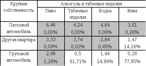Z-статистики и значимость (%) связи покупки алкоголя и табачных изделий и наличие крупной собственности (фрагмент таблицы, Z-статистики)