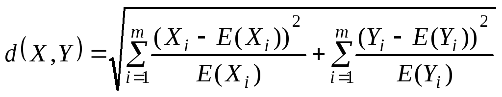 которые, предположительно, являются векторами частот. Здесь рассматриваются ожидаемые значения элементов, равные E(Xi) = X. (Xi +Yi) / (X. +Y.) иE(Yi) = Y.(Xi +Yi)/ (X. + Y.), а расстояние хи-квадрат имеет вид корня из соответствующего показателя