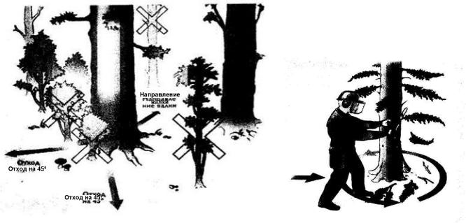 После определения направления валки дерева вокруг него в радиусе 0,6-1,0 м удаляют подрост и подлесок, убирают предметы, препятствующие валке. В зимний период утаптывают снег на прикорневой площадке, а при глубине снежного покрова более 0,4 м его расчищают. Для отхода вальщика в безопасное место прокладывают пути отхода длиной 4-5 м в направлении, противоположном падению дерева под углом 45°.
