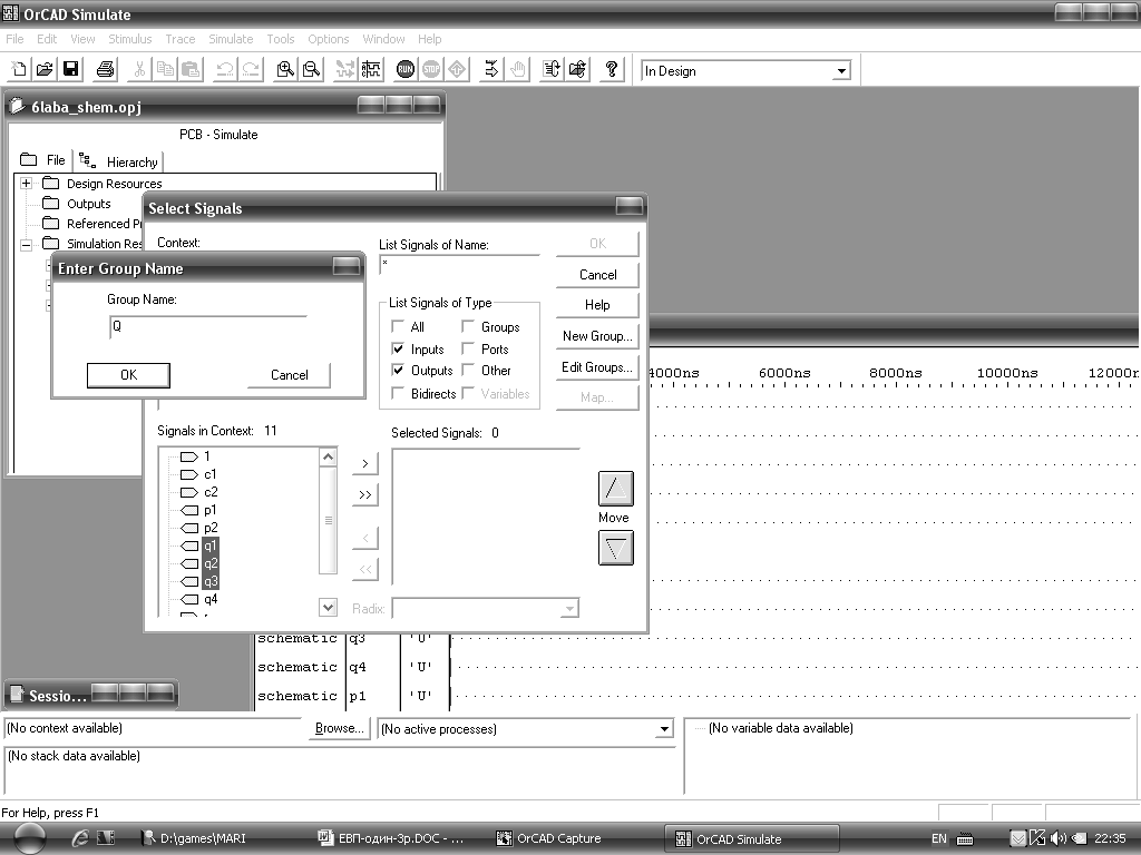 При отриманні часової діаграми роботи лічильника слід виконати групування сигналів стану для більш зручного сприйняття послідовності станів лічильника. Для цього після виконання команди Trace→New Wave Window у вікні Select Signals виділяють вихідні сигнали схеми, які показують стан лічильника, та натискають кнопку New Group, після чого у вікні, що відкривається, вводять ім’я групи (рис. 1.16). Цю групу також включають до переліку сигналів часової діаграми.