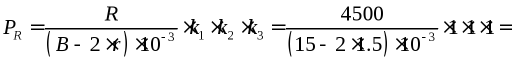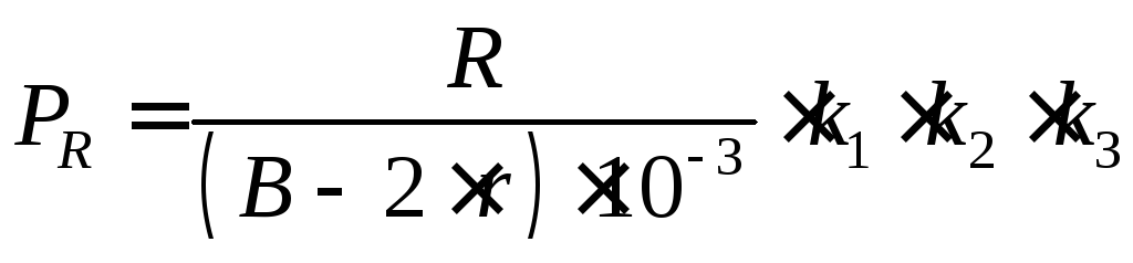 де R – радіальне навантаження, Н; B – ширина підшипника, м; r – радіус закруглення фаски кільця, м; k1 – динамічний коефіцієнт посадки, що залежить від характеру посадки (от 1 при спокійному навантаженню (помірні поштовхи, вібрація, перевантаження до 150%) до 1,8 при навантаженні із сильними ударами та вібрацією і перевантаженні до 300%); k2 – коефіцієнт, що враховує ступінь ослаблення посадочного натягу при пустотілому валі (від 1 при суцільному валі до 3) та тонкостінному корпусі (від 1 до 1,8); k3 – коефіцієнт нерівномірності розподілу радіального навантаження R між рядами тіл кочення підшипника при наявності осьової сили (від 1 при відсутності осьової сили до 2).