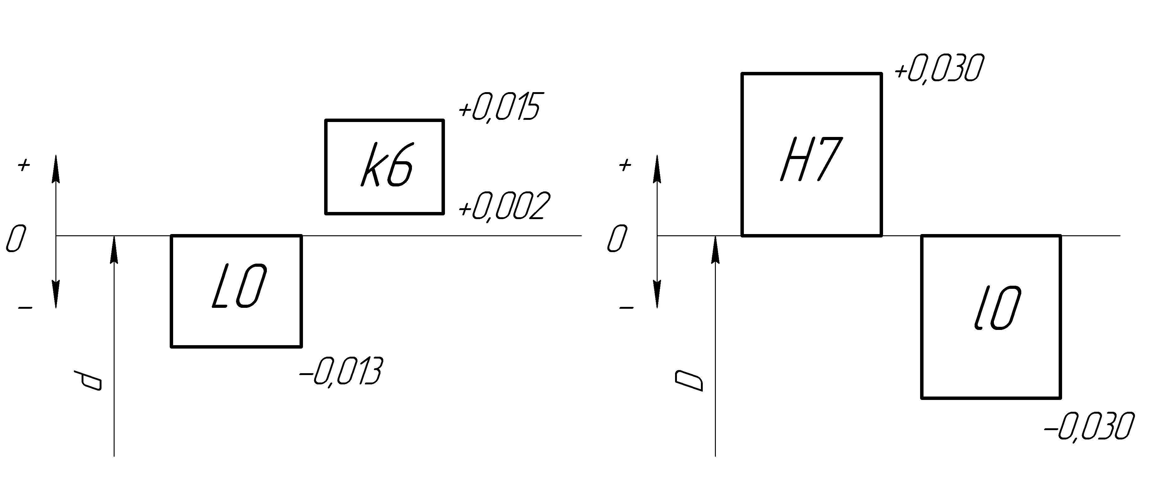Назначаються поля допусків кілець підшипника (додаток 5). Зовнішнє кільце виготовлюється в системі вала, а внутрішнє в системі отвору. Але поле допуску внутрішнього кільця розміщено не “в тіло” кільця, як в основного отворі, а “з тіла”. Це зроблено для збільшення величини натягу між внутрішнім кільцем і валом. Поле допуску зовнішнього кільця при нульовому класі точності підшипника позначається l0, а поле допуску внутрішнього кільця – L0.