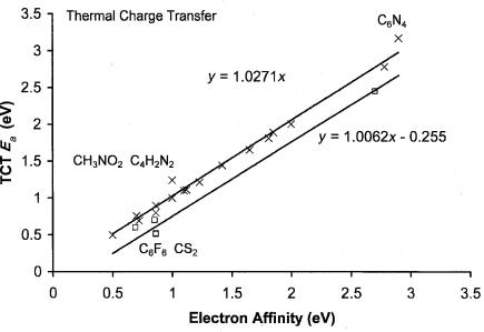 The combined random and systematic uncertainties in the absolute values due to the direct measurements and uncertainties in the reference compounds are quoted at0.1 eV for the HPMS method and 0.05 eV from the ICR method. The uncertainties in specific values can be lower or higher. At the extremes the uncertainties in the values can be as large as 0.2 eV. Some of the molecular Ea determined using the ICR and TCT methods are shown in the precision and accuracy plot in Figure 6.12. The ICR value for C6F6 is consistent with the ground-state value of 0.86 0.02 eV obtained from the ECD, NIMS, and PES studies. The data in Figure 6.12 illustrate the precision of the values. The slope of the zero intercept is 1.027(30) and the standard deviation of the values calculated using this equation is 0.1 eV. The largest deviations occur at the extremes. If these are excluded, the standard deviation is reduced to 0.07 eV. The average deviation of the excited-state values is 0.245 eV, confirming the assignments to excited states. The ICR value for fluoroanil (2.45(5) eV), and the HPMS values for C6F6 (0.52(10) eV), CS2 (0.62(10) eV), azulene (0.70(10) eV), and anthracene (0.60(10) eV) are assigned to excited states. The latter two are confirmed by ECD and PES data.