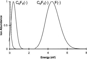 Experimental data obtained from the electron impact studies of SF6, C6H5Cl, and C6F6 are shown in Figures 6.13 to 6.15 [68–70]. The data for SF6 were obtained in 1979 using a traditional experimental apparatus, whereas the C6H5Cl data are an example of data collected using a combined electron transmission and electron impact source. The observation of a negative-ion peak at zero energy is an indication of a positive adiabatic and vertical ground-state electron affinity. The peak in the cross-section for SF5( ) formation is a measure of an excited-state vertical