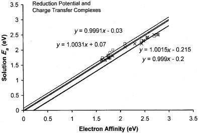 In Figure 6.17 the electron affinities of several substituted quinones determined from E1=2 measurements, and/or charge transfer spectra, are plotted versus the current evaluated gas phase values. They are chosen to give a comparison of the values obtained by the two methods and to note the deviations from the unit slope line. The displacement of the unit slope lines by a constant amount is a systematic uncertainty. This indicates that the solution energy differences and constants used to correlate the charge transfer complex data are both a function of the electron affinity and/or the type of molecules [78]. Thus, it will be possible to reduce deviations by classifying the molecules and identifying the functional relationship.