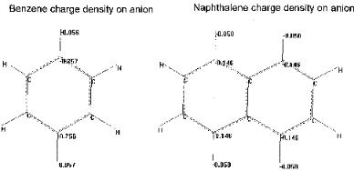 Figure 7.5 Charge densities on the anions of benzene and naphthalene calculated with MINDO/3. The localized charge is lower in naphthalene than benzene.