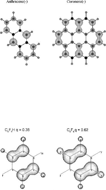 Figure 7.8 Three-dimensional spin densities and charges for one electron distributed on one anthracene and one coronene molecule calculated using MINDO/3.