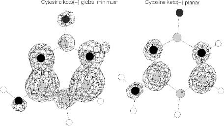Figure 7.10 Three-dimensional spin densities for planar and distorted anions of cytosine calculated with AM1 [3].