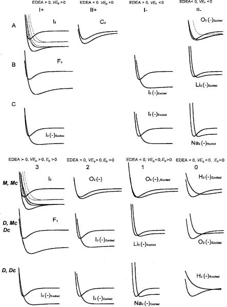 The electron affinities of many homonuclear diatomic molecules have been measured by anion photoelectron spectroscopy or photodetachment, but few Morse potential energy curves have been calculated. The AEa for H2 and N2 are positive but small since the ground-state anions correspond to long-range ion polarization states. The anions are as follows: H2 [M(0), Mc(0); D, Dc(0)]; Li2 [M(2), Mc(2), D(1)]; C2 [M(2), Mc(2)]; O2 [M(2, 1), Mc(2, 1, 0); D(0), Dc(0)]; F2 [D(3, 2), Dc(3, 2)]; Na2 [M(2), Mc(2); D(1), Dc(1)]; and I2 [M(3), Mc(3); D(3, 2), Dc(3, 2)] illustrate the classes as shown in Figure 7.11.