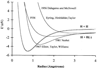 Figure 7.12 Historical Morse potential energy curves for H2 and its anions, dating back to 1936 [25], 1956 for the excited state [26], 1967 for the polarization ground state [27], and 1981 for the valence excited state [28].