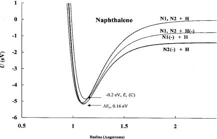 For naphthalene there should be nine negative-ion states: the polarization state, four bonding states, and four antibonding states. The ground state has a positive electron affinity of 0.16 eV and dissociates via the 1 C-H bond. The polarization state and a state dissociating via the 2-C-H bond have positive electron affinities of 0þ and 0.13 eV respectively. The excited-valence-state curve dissociating to H( )