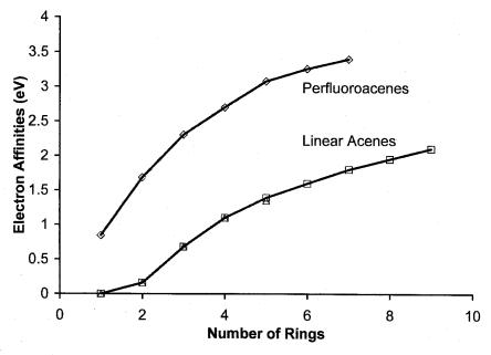 The linear acenes illustrate the effect of extended conjugation. As the number of rings is extended in both the hydrocarbons and perfluorinated hycrocarbons, the Ea increases. However, for a nonlinear extension the Ea may or may not increase. For example, the Ea of phenanthrene is 0.30 0.02 eV, while that for anthracene is 0.68 0.02 eV. Likewise, the Ea of benzanthracene is less than that of tetracene. The curves for the linear acenes are an upper limit for the electron affinities of polycyclic aromatic hydrocarbons with the same number of six membered rings. The inclusion of five or seven membered rings will increase the electron affinity above those with solely six rings. The simplest example is the Ea of azulene, 0.8 eV, versus that of naphthalene, 0.16 eV. Interestingly, the calculated electron affinity of the perfluorinated azulene is 2.6 eV or about 0.2 eV per fluorine atom.