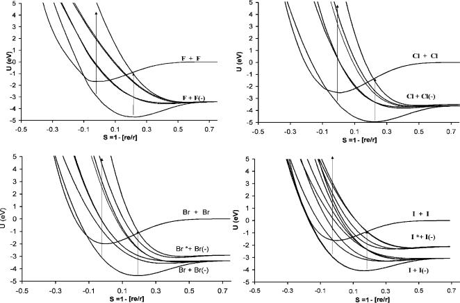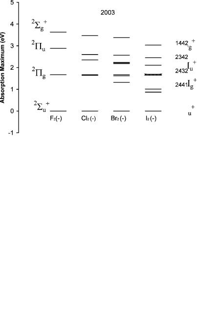 In 1985 we began a series of papers devoted to Morse potential energy curves for the halogen anions, X2( ), the rare gas positive-ion dimers, Rg2(þ), and the Group VI homonuclear diatomic anions. These curves were updated periodically based on new experimental data [8–11]. Curves for the anions of the alkali metal dimers and coinage metals dimers, M2( ), have been constructed but not published. Originally, the ground-state electron affinities for the X2 were available from gas phase experiments. The ECD had been used to measure the activation energies for thermal electron attachment. The electron impact ion distributions had been measured for all the X2 except for I2. For some of the anions the frequencies had been measured in the solid state and the absorption spectra in solution.