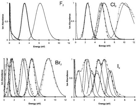 available in the literature that best agree with experiment. The best I2( ) values derive from PES. The internuclear distances for Cl2( ) and Br2( ) are determined from the experimental VEa. The dissociation energies are defined from the AEa and Rg2(þ) values. The frequencies are experimental values measured in solids. Five or six data points define these curves, and systematic uncertainties should be smaller than random uncertainties. The parameters for F2 are less certain. The dissociation energy from the experimental AEa is 3 meV lower than the value for Ne2(þ). The internuclear distance is higher than the one obtained via AMB, but less than the NIST value. The frequency chosen is the NIST value with AMB random uncertainty. There are no ECD data for F2, but other studies give a low E1, as will be shown in simulated ECD data [1–3, 5, 8, 9, 14–19].
