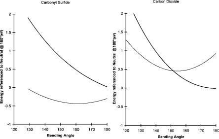 Figure 9.25 CURES-EC AM1 calculations of the energy for the neutral and negative ions of CO2 and COS as a function of the bending angle.