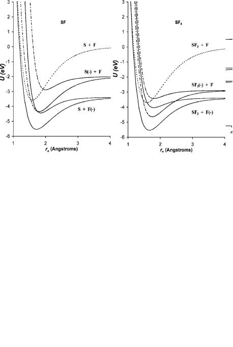 Figure 9.28 Morse potential energy curves for the neutral and negative-ion states of SF and SF4.