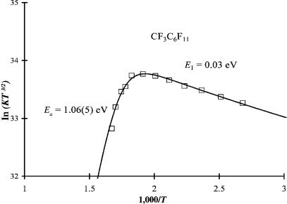 Figure 11.4 Plots of NIMS data as ln KT3/2 versus 1,000/T for perfluoromethylcyclohexane C7F14. Similar data are available for C6F12, perfluoromethylcyclopentane. The Ea and Qan values are given in Table 11.5. The analysis appears in this work.