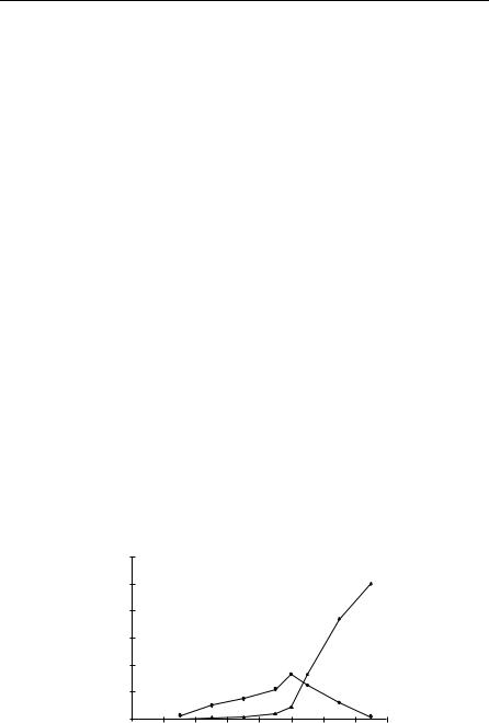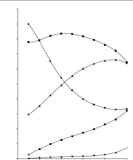 In a study of water, Kier and Cheng36 found relationships between the average cluster size and viscosity, and between the fraction of unbound cells, f0, and the vapor pressure. The number of water-designated cells was chosen to be 69% of the cells in the grid, this value giving a concentration of unbound water molecules in agreement with earlier predictions and experiments.30,39 More recent studies have examined all the fx attributes from the rules PB and J, whereby the PB(W) value was systematically varied. A profile of water cells, described by the fraction of each bonding type, f0–f4, for each ‘‘temperature’’, is shown in Figure 14. The values of f0 correspond closely to the values used by Walrafen39 and Haggis et al.40 to predict the dielectric constant and heat capacity of water. This finding led to the conjecture that the rules chosen give rise to configurations mirroring physical reality. A test of this possibility is reported in Table 1 where a set of equations relating several physical properties of water to attributes from the cellular automata simulations are shown. In addition to the examples in the table, the free hydrogen fraction, fH, is close to the value of about 15% reported from infrared (IR) evidence of the free OH content.41 These correlations between simulated water attributes and various physical properties suggest that the water model created with cellular automata has validity.36