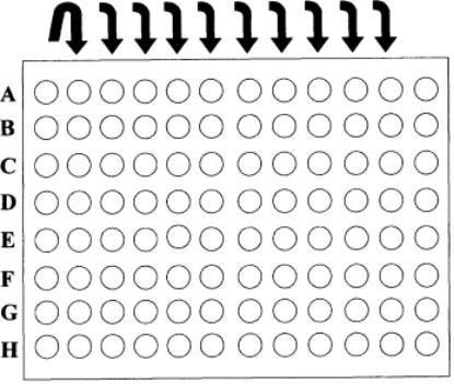 1. Examine a plate, note the position of letters A¨CH and the numbers 1¨C12. Place the plate with A at the top lefthand corner in front of you, as in Fig. 1. The 8 wells labeled with letters (A¨CH) are referred to as rows. The 12 wells labeled by numbers (1¨C12) are referred to as columns.